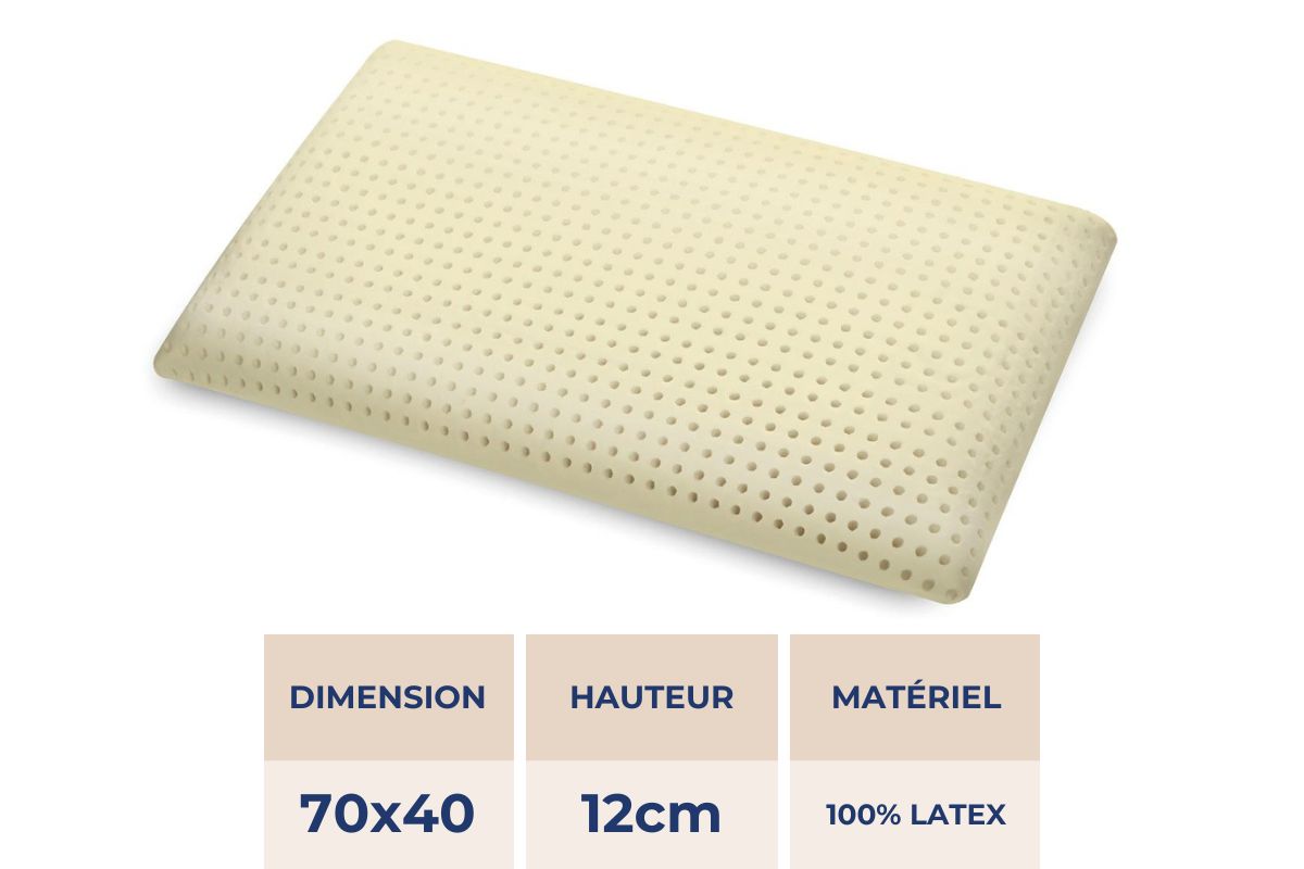 Les oreillers ont des dimensions de 70×40 centimètres et une épaisseur de 12 cm. Fabriqués entièrement en latex, c’est un oreiller absolument naturel et sain, hautement respirant.