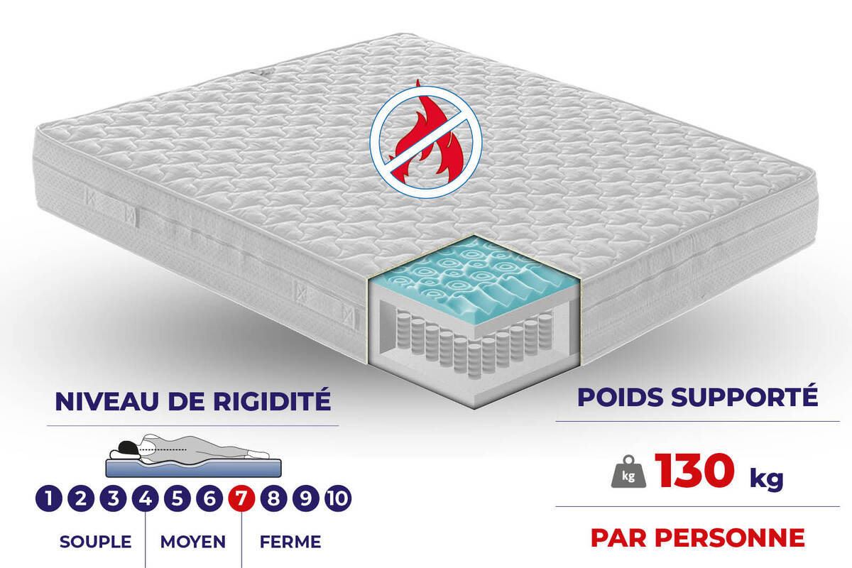 La gamme de matelas ignifuges « H20 ignifuge » est conforme à la certification de classe « 1IM » délivrée par le Ministère de l’Intérieur uniquement aux produits ayant passé avec succès tous les tests de qualité requis pour être déclarés totalement ignifuges. Il s’agit de matelas en polyuréthane expansé ignifugé « DS30 », extrêmement pratiques et confortables, qui s’adaptent au profil du corps en fonction de la pression exercée. La feuille interne en polyuréthane ignifuge a une épaisseur de 18 centimètres, flexible et indéformable, mais aussi légère et résistante. La hauteur totale du matelas est de 20 centimètres. Les caractéristiques de la couche interne font des produits « H20 » des matelas ignifuges pour les hôpitaux, cliniques et installations hôtelières.