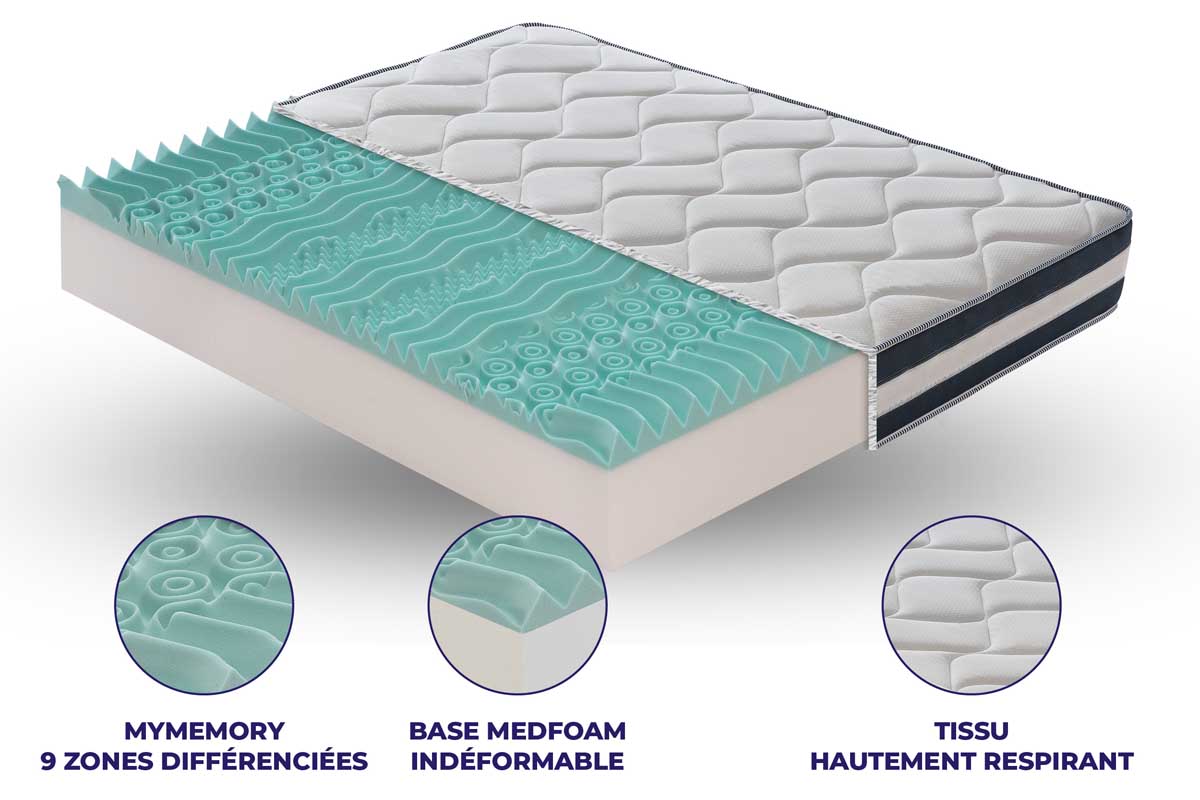 MyMemory est un matériau innovant, composé de polymères à cellules ouvertes qui garantissent un haut niveau de respirabilité, évitant les problèmes d’humidité et assurant un repos sec et sain.