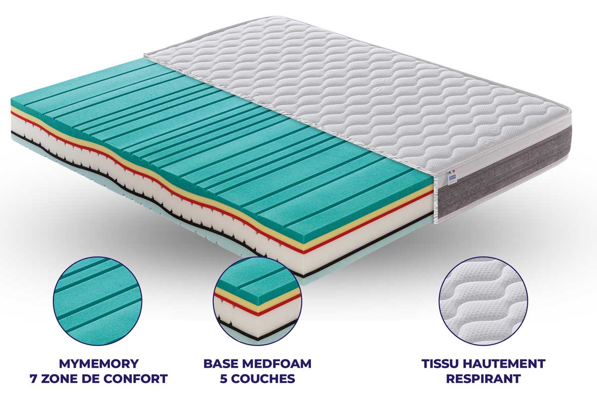 • La couche de mousse à mémoire de forme « MyMemory » mesure 4,5 cm de haut, la hauteur totale du matelas est d’environ 26 cm